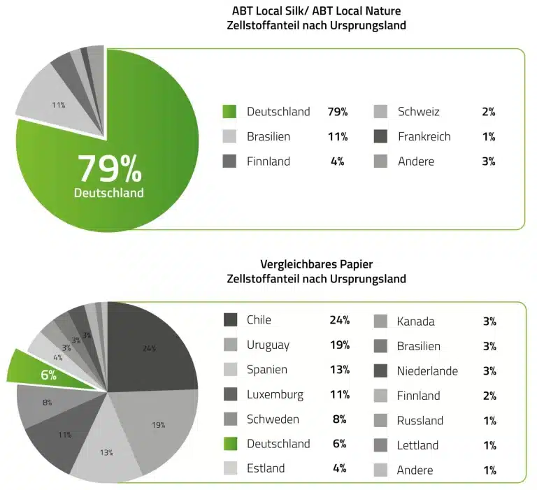 Unsere Entscheidung für ABT Local Paper basiert auf dem Anspruch, Nachhaltigkeit und Regionalität zu vereinen. Der Zellstoff, den wir verwenden, stammt zu 79 % aus einem Umkreis von 200 km. Dadurch reduzieren wir nicht nur lange Transportwege, sondern senken auch den CO₂-Ausstoß signifikant – ein wichtiger Beitrag zum Klimaschutz. Gleichzeitig fördern wir eine nachhaltige Forstwirtschaft, die darauf abzielt, regionale Wälder und Ökosysteme langfristig zu schützen und zu bewahren. Die Nutzung von Zellstoff aus verantwortungsvoll bewirtschafteten Wäldern stärkt nicht nur den Umweltgedanken, sondern auch die lokale Wirtschaft, indem sie Arbeitsplätze in unserer Region sichert.